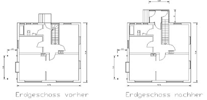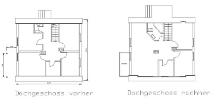|   | Das schon bewohnte Erdgeschoß wird bis auf die andere Treppenführung nicht verändert. Im Obergeschoß werden Wände so herausgenommen, dass ein großer Wohn- und Eßbereich mit Wohnküche entsteht, sowie ein großes Badezimmer. Eine langgestreckte Dachgaube ermöglicht die Vergrößerung des Stehbereichs. Das Dachgeschoß wird zu einer Galerie ausgebaut und mit Dachflächenfenstern versehen. |  | |